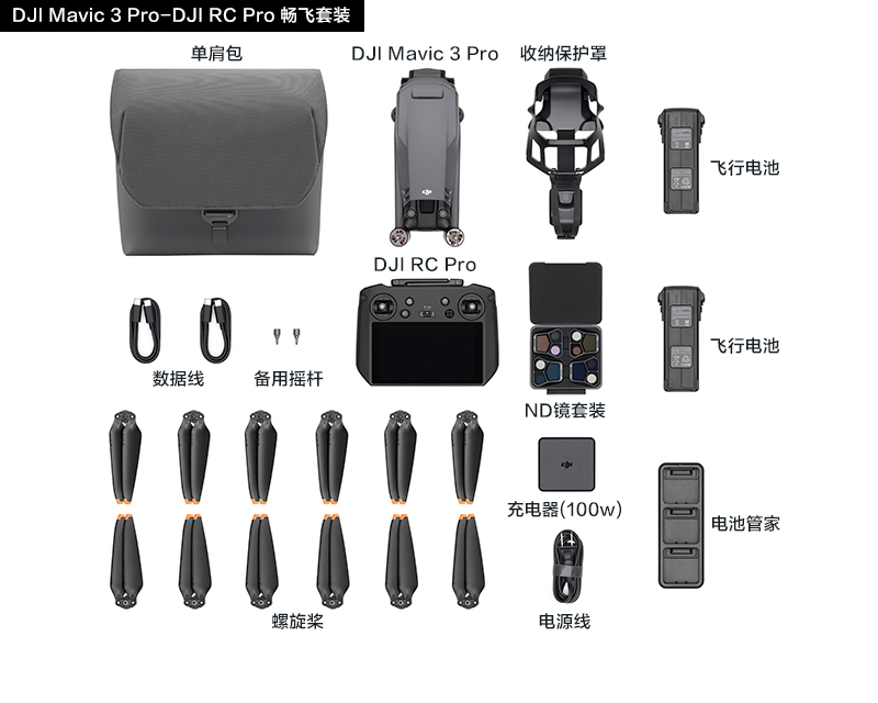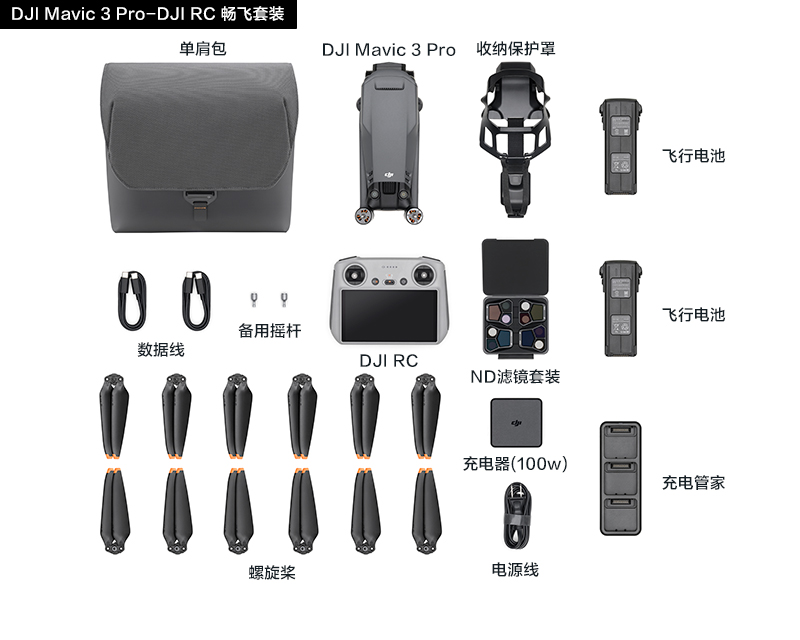 DJI Mavic 3 Pro 智能飞行电池首次使用需要充电激活,推荐使用DJI官方提供的充电设备给电池和遥控器充电,如 DJI 100W 桌面充电器或 DJI 65W 便携充电器,您可参考以下内容为智能飞行电池及遥控器充电: